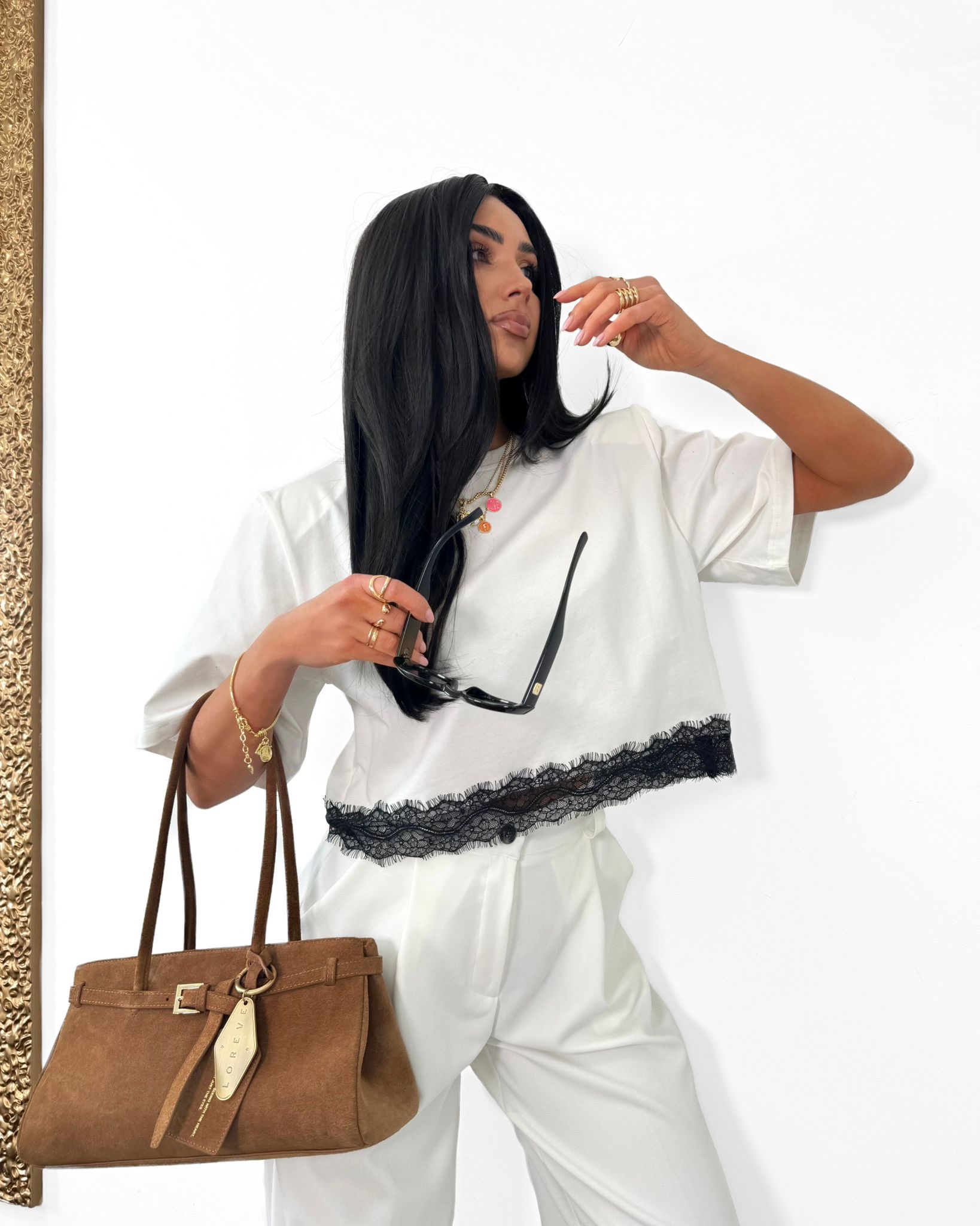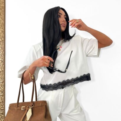 Bluzka T-shirt biały z czarną koronką onesize