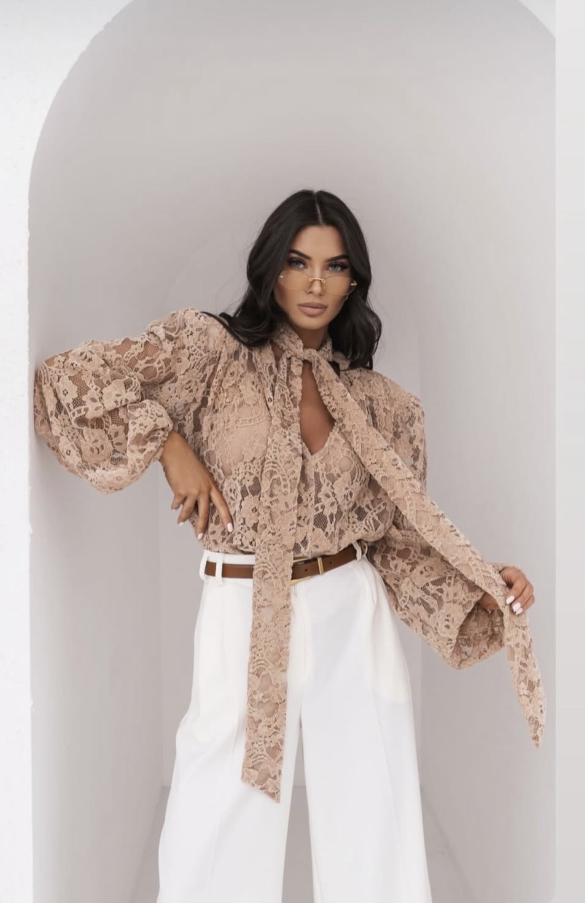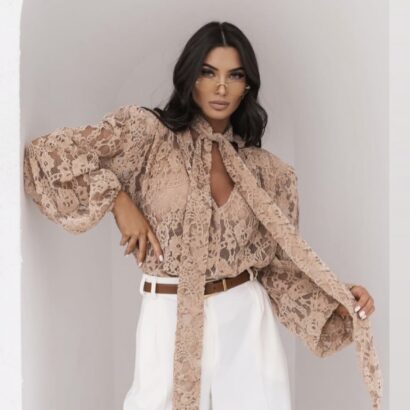Elegancka koszula damska o wyjątkowo kobiecym charakterze, wykonana z delikatnej, ażurowej tkaniny z dekoracyjnym wzorem. Model z długim rękawem zakończonym subtelną falbaną, który dodaje lekkości i modowego wyrazu. Koszula posiada efektowne wiązanie przy dekolcie, umożliwiające stylizację na wiele sposobów – zarówno bardziej formalnie, jak i casualowo.