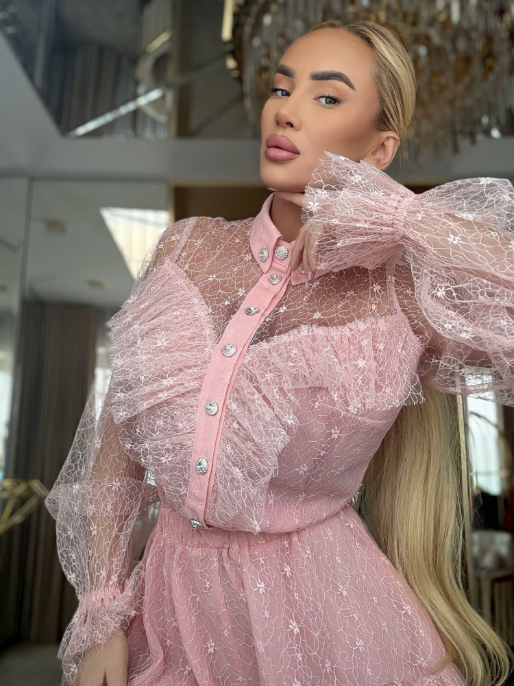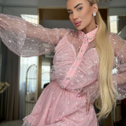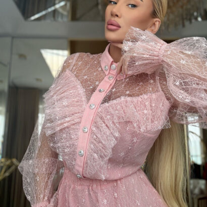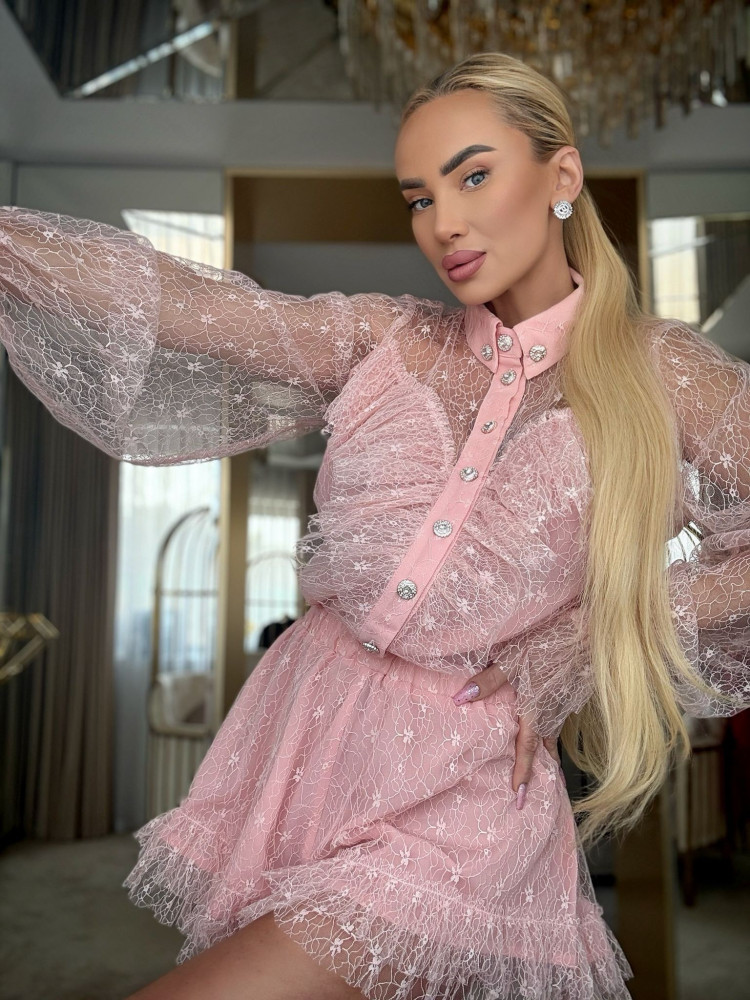 Krótki kombinezon wykonany jest z przepięknej koronki w subtelny wzór kwiatów w odcieniu różu, który od wewnątrz uzupełniony jest szyfonem w tej samej kolorystyce. Koronka ma efekt przebijający na ciało delikatnie eksponując dekolt z przodu, plecy oraz ręce. Świetnym elementem zdobiącym produkt są falbanki z przodu kombinezonu, na dole rękawów oraz nogawek. Górna część kombinezonu z kołnierzykiem ma luźniejszy krój i zapinana jest na ozdobne, mieniące się guziki w srebrnym kolorze. W talii znajduje się wszyta elastyczna guma, dzięki czemu dopasowuje się i podkreśla figurę. Nogawki uzupełnione są od wewnątrz szyfonem, tak jak górna część kombinezonu z przodu. Długie rękawy zakończone są ściągaczem.