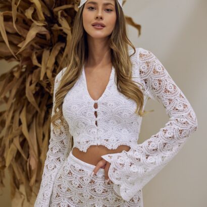 Zmysłowy i ultrakobiecy komplet stworzony z myślą o letnich dniach. Bluzka z głębokim dekoltem i długimi, lekko rozszerzanymi rękawami pięknie eksponuje sylwetkę, a krótka spódniczka na gumce podkreśla talię i dodaje lekkości. Przewiewna tkanina delikatnie otula ciało, tworząc look pełen romantyzmu i swobody. Venus to esencja letniego uroku.