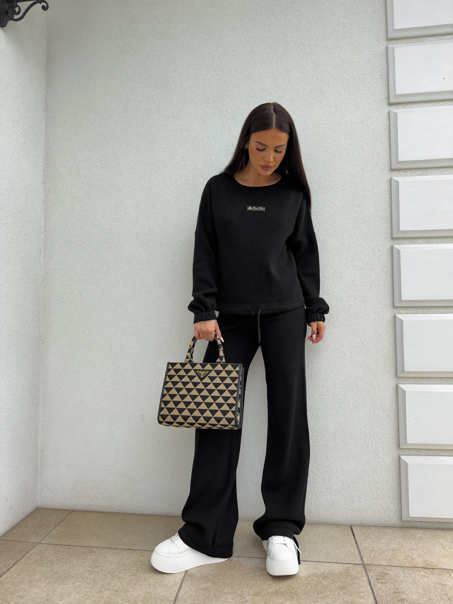 Stylowy komplet wykonany z miękkiej, przyjemnej w dotyku dzianiny, idealny na chłodniejsze dni. Składa się z oversize’owego swetra z długimi rękawami oraz spodni z wysokim stanem, uszytych z tej samej tkaniny. Sweter zakładany przez głowę, wyposażony w troczki umożliwiające regulację długości – możesz nosić go na różne sposoby, dopasowując do swojego stylu. Spodnie z szerokimi nogawkami i wygodną gumką w pasie zapewniają komfort noszenia. Nogawki również wykończone troczkami, co pozwala na subtelne modelowanie ich kształtu. Komplet idealny zarówno do relaksu w domu, jak i na niezobowiązujące wyjścia.