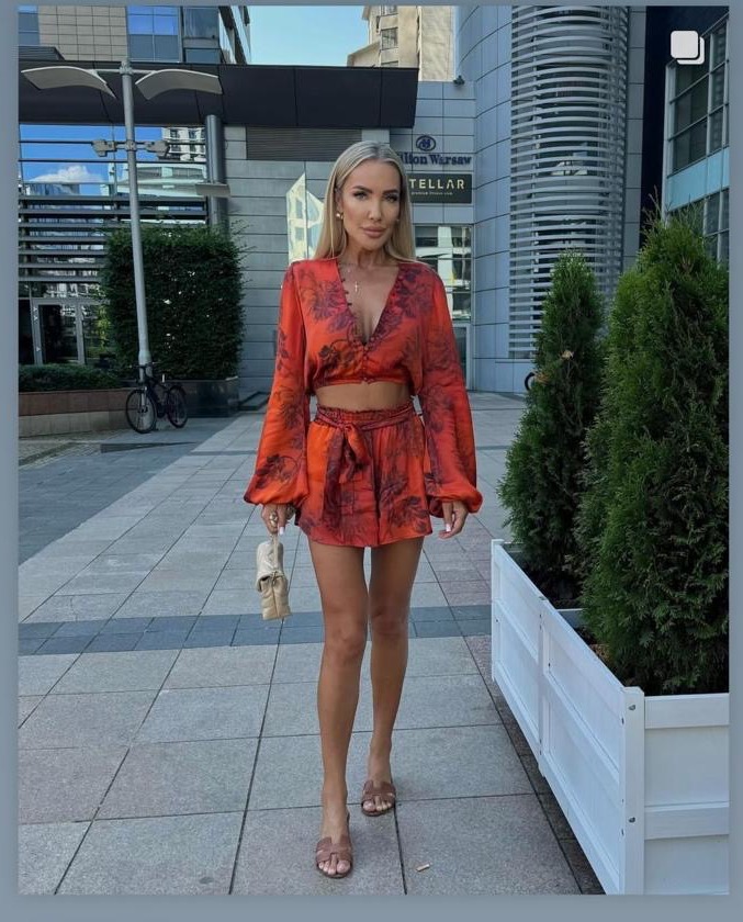 Czteroczęściowy komplet wykonany z satyny w czerwono-ceglanej kolorystyce. Góra w formie koszuli na guziczki, dzięki czemu możemy regulować głębokość dekoltu. A do tego spodenki z gumką w pasie, do tego gołączony mamy pasek, który możemy przewiazać w pasie lub np do torebki. Do zestawu dołączona również chusta na głowę.