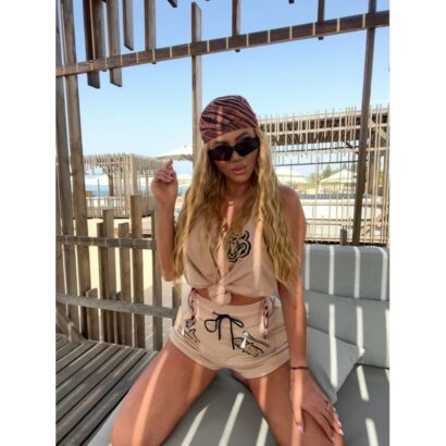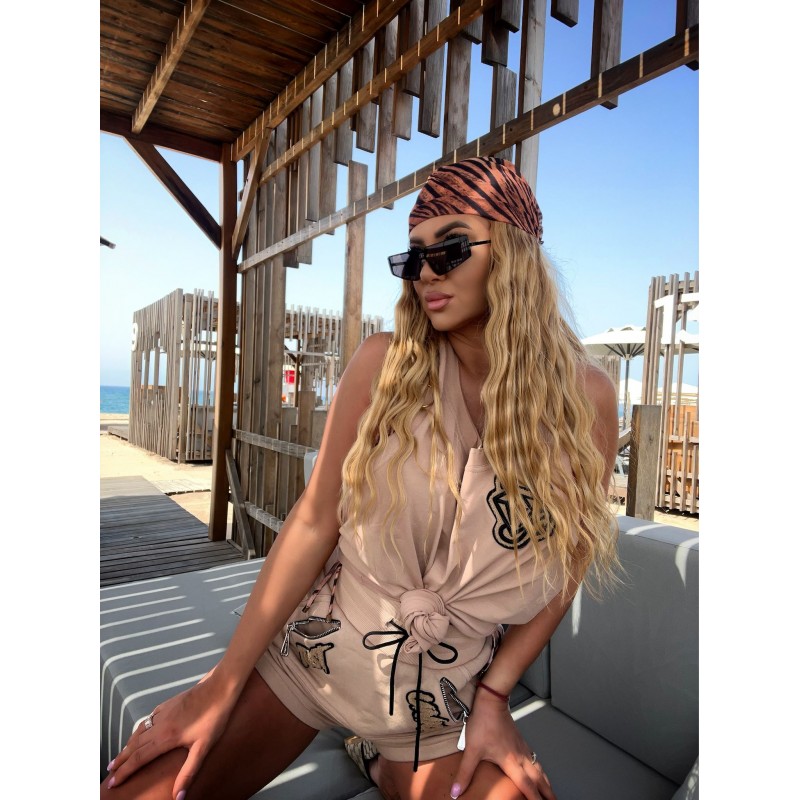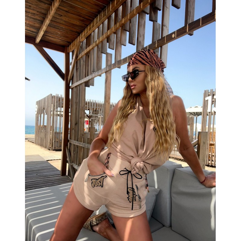 Damskie spodenki wykonane z bawełnianej dzianiny dresowej w odcieniu ciepłego beżu. Model z wysokim elastycznym stanem z dodatkowo wpuszczonym w tunel czarnym sznurkiem do wiązania. Poniżej znajduje się kieszeń typu kangur zasuwana po dwóch stronach na logowane zamki. Model ozdobiony jest naszywkami w beżowym kolorze metodą chenille (haft pętelkowy wykonywany włóczką) w postaci oddzielnego napisu Just Unique. Nogawki na dole łagodnie wycięte do boku.