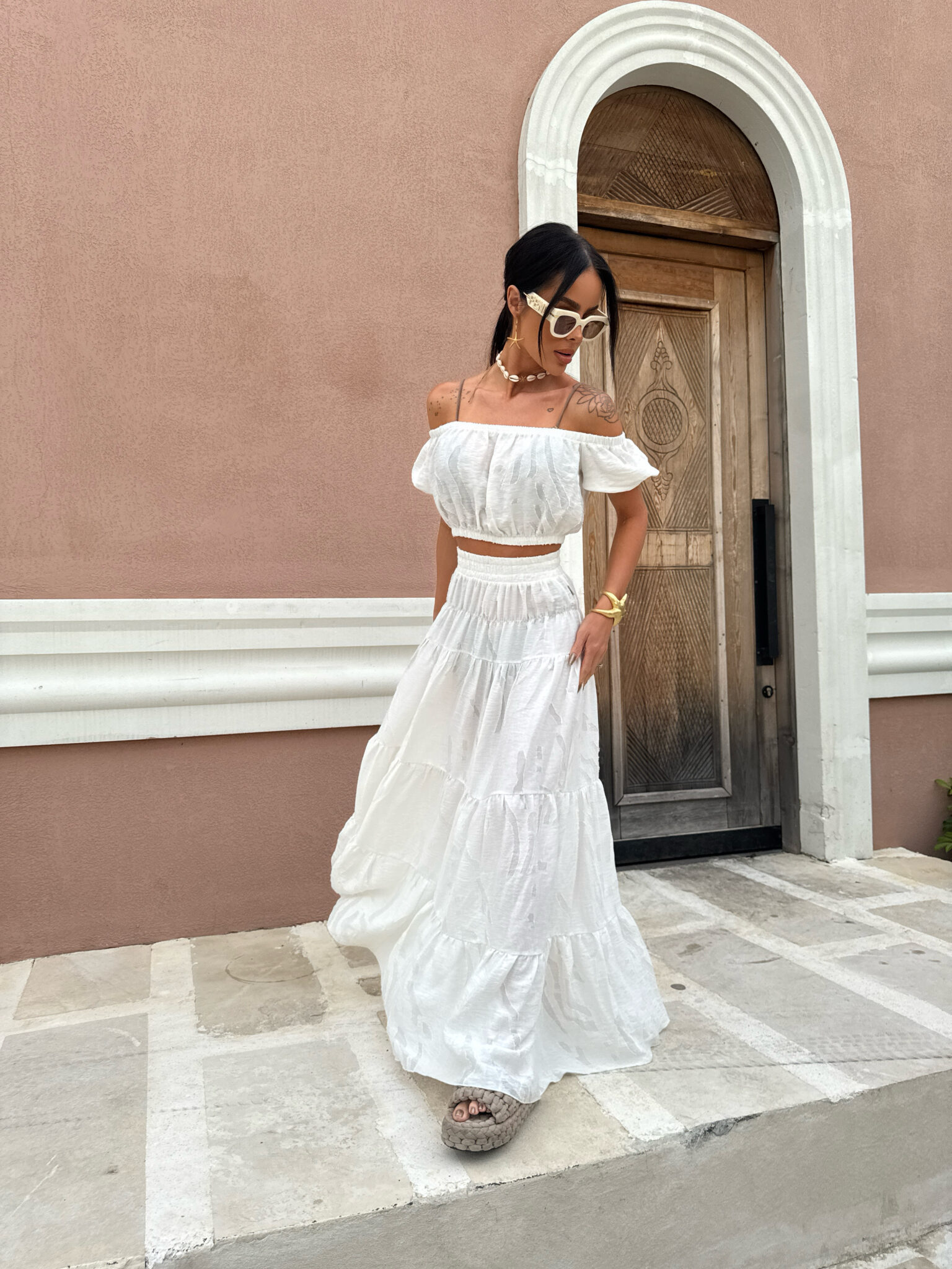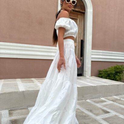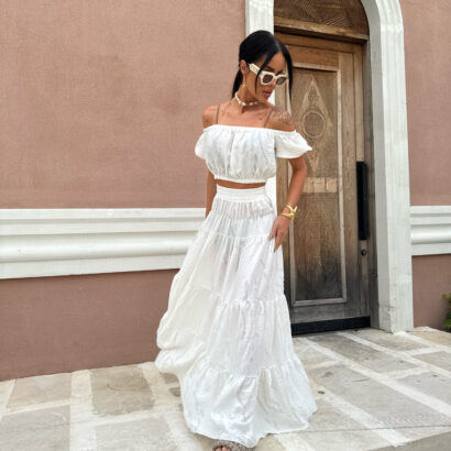 Komplet składa się z krótkiego topu z odkrytymi ramionami i marszczeniem oraz długiej, zwiewnej spódnicy w tym samym stylu, wykonany jest z lekkiego, półtransparentnego materiału z delikatnym połyskiem i subtelnym, wytłaczanym wzorem dodającym elegancji i letniego luzu, całość idealnie wpisuje się w klimat resortowy dzięki jasnej kolorystyce i kobiecej formie która pięknie układa się w ruchu i zapewnia komfort nawet w upalne dni.