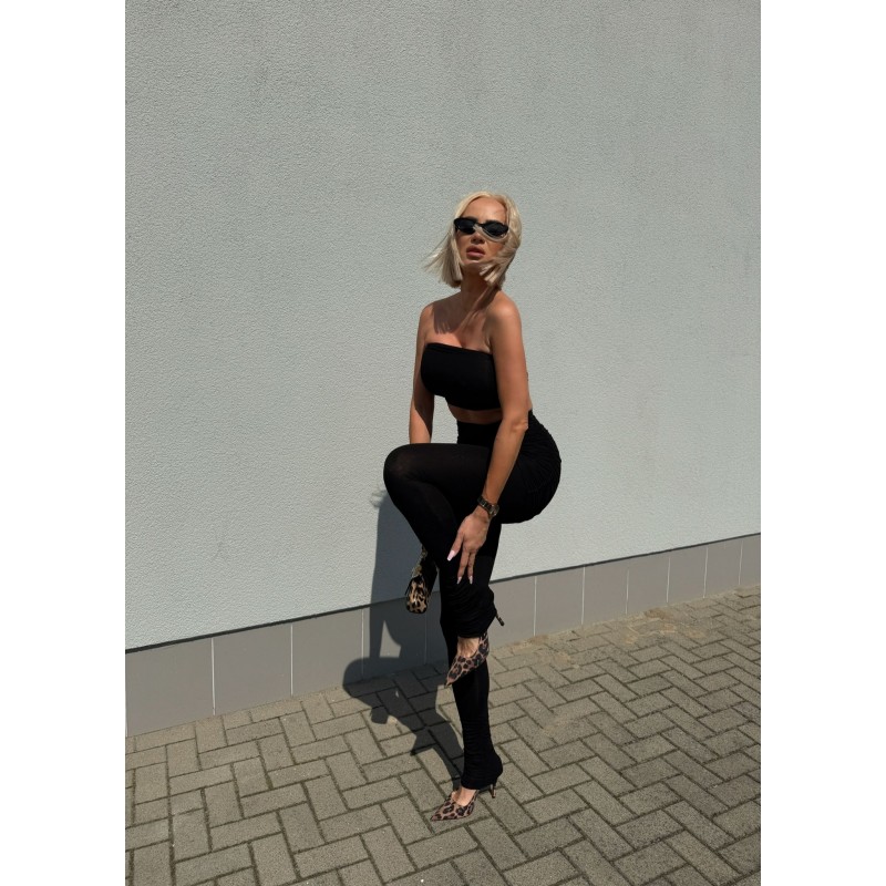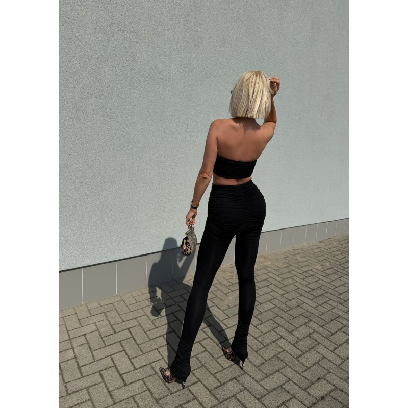 Legginsy wykonane z elastycznej wiskozy w czarnym kolorze. Fason legginsów jest świetny, gdyż sprawdzi się zarówno na co dzień, jak w eleganckiej wersji ze szpilkami. Posiada oczywiście wysoki stan z elastyczną guma w talii, lecz kluczowym elementem w tym projekcie jest dodatkowa tkanina na wierzchu tworząca efekt spódniczki. Spódniczka marszczona jest po całej długości, co dodatkowo podkreśla figurę. Dół nogawek zakończony jest także marszczeniami.
