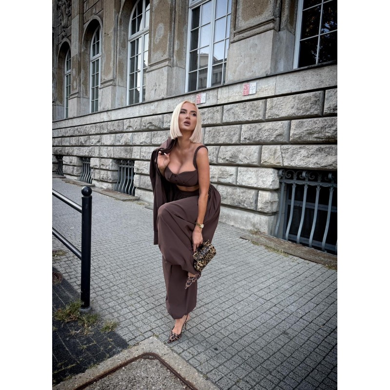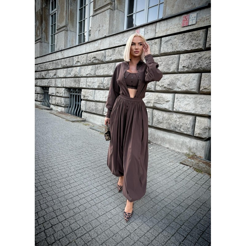 Spodnie wykonane z koszulowej tkaniny w brązowym kolorze. Fason z wysokim stanem z elementem ściągacza, dzięki czemu idealnie się dopasują w talii. Wzdłuż przodu od talii posiada rząd guzików w brązowym odcieniu. Szerokie, zwiewne, bufiaste nogawki o kroju „alladynek” zakończone są na dole elementem ściągacza.